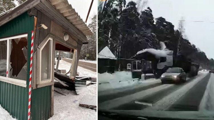 Водитель тягача с прицепом врезался в будку сотрудников погранслужбы на въезде в поселок Лебяжье Ленинградской области. К счастью, в момент столкновения будка была пустой.